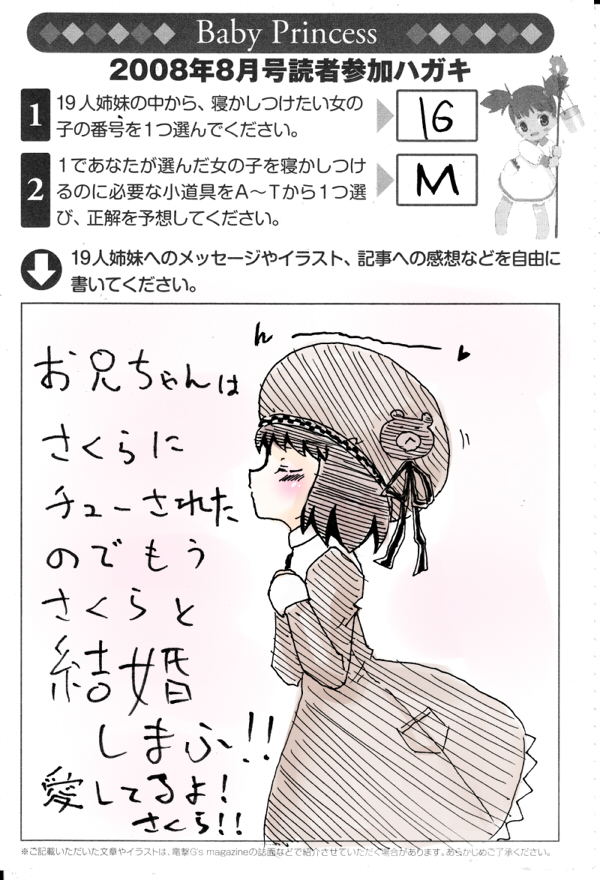 補足感謝です べびプリ保管庫さん 7/23日のさくらのべびプリ公式日記はやばいですね。 どうしよう? これはもうさくらと結婚するしかないんじゃないっすか? いやね、もうさくら本気で可愛いんですよ! ただでさえ愛が溢れて大変なことになってるのに毎回毎回さくらの日記は オニイチャンの理性を見事に破壊してくれますね。